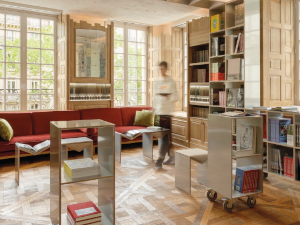 Allant de la street culture aux designers japonais, les ouvrages ont été sélectionnés par Frank Audoux dans le catalogue de la célèbre maison d’édition new-yorkaise qui a publié French Moderne Cocktails, son livre paru en 2019, un instantané des Années folles et de l’âge d’or du cocktail. L’occasion d’en découvrir un peu plus sur ses goûts installé dans un canapé en velours rouge, un verre à la main. Mais aussi de rendre hommage à l’esprit littéraire cher au quartier de Saint-Germain. Au troisième étage, un petit salon aux murs habillés de fresques avec son “tiny bar” métallique se distingue avec sa proposition singulière. Ici, côté drinks, seule la collection de cocktails en bouteilles signée Cravan est au programme des dégustations.